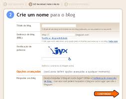 3-Apos o 2° passo concluido"passemos para o3° Escolhendo um titulo no campo indicado "Título do blog" e um endereço no espaço Endereço do blog "URL", o que digitar aqui será o link do seu blog, por exemplo: http://www.dicaspersonalblog.blogspot.com,"Em algumas ocasioes e necessario testar alguns titulos pra verificação,pois pode ocorrer de alguem ja ter criado um blog com o titulo que voçe tem em mente",Então escolha um nome e clique m verificar disponibilidade. Depois de achar um endereço disponível digite os caracteres de verificação e clique em continuar.